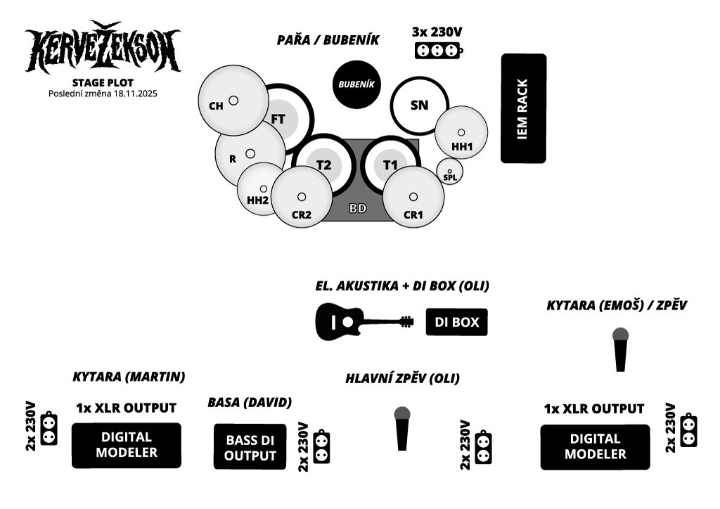 Aktuální sestava ve složení: basa – David, blány – Pařa, kytara – Emoš, kytara – Martyn, zpěv – Oli vás tímto zve na nezapomenutelný interdimenzionální hudební kervežitek. Nyní si prosím najděte pohodlné místo, připravte si záchranné vesty a buďte připraveni na vzrušující hudební dobrodružství! Vzhůru dolů, KERVE!